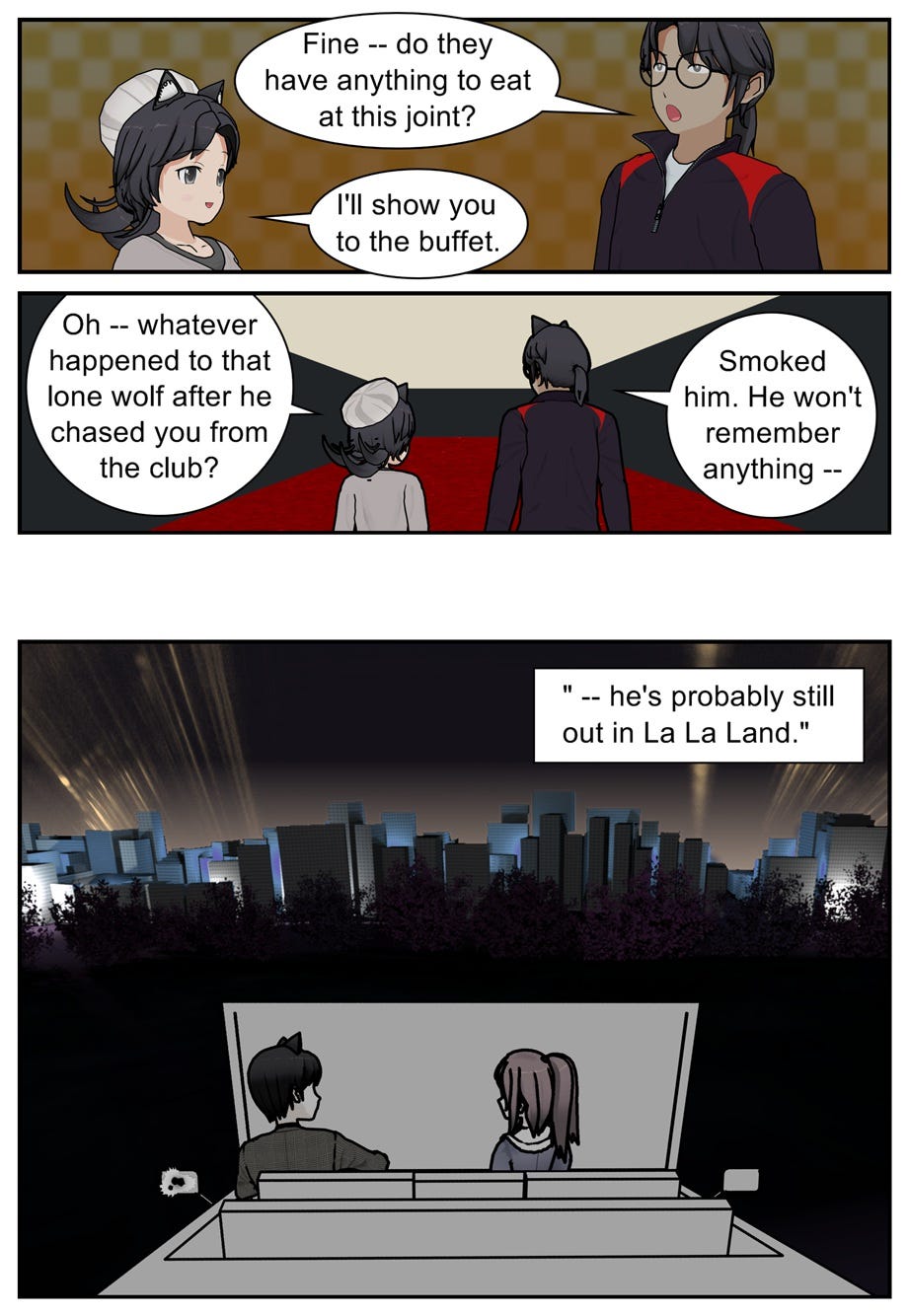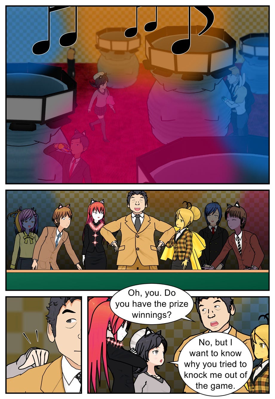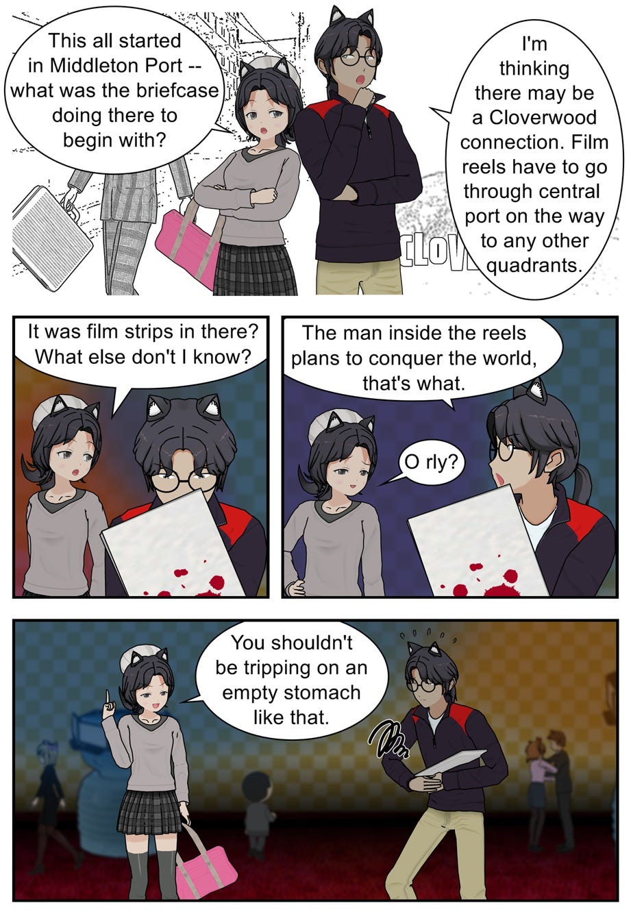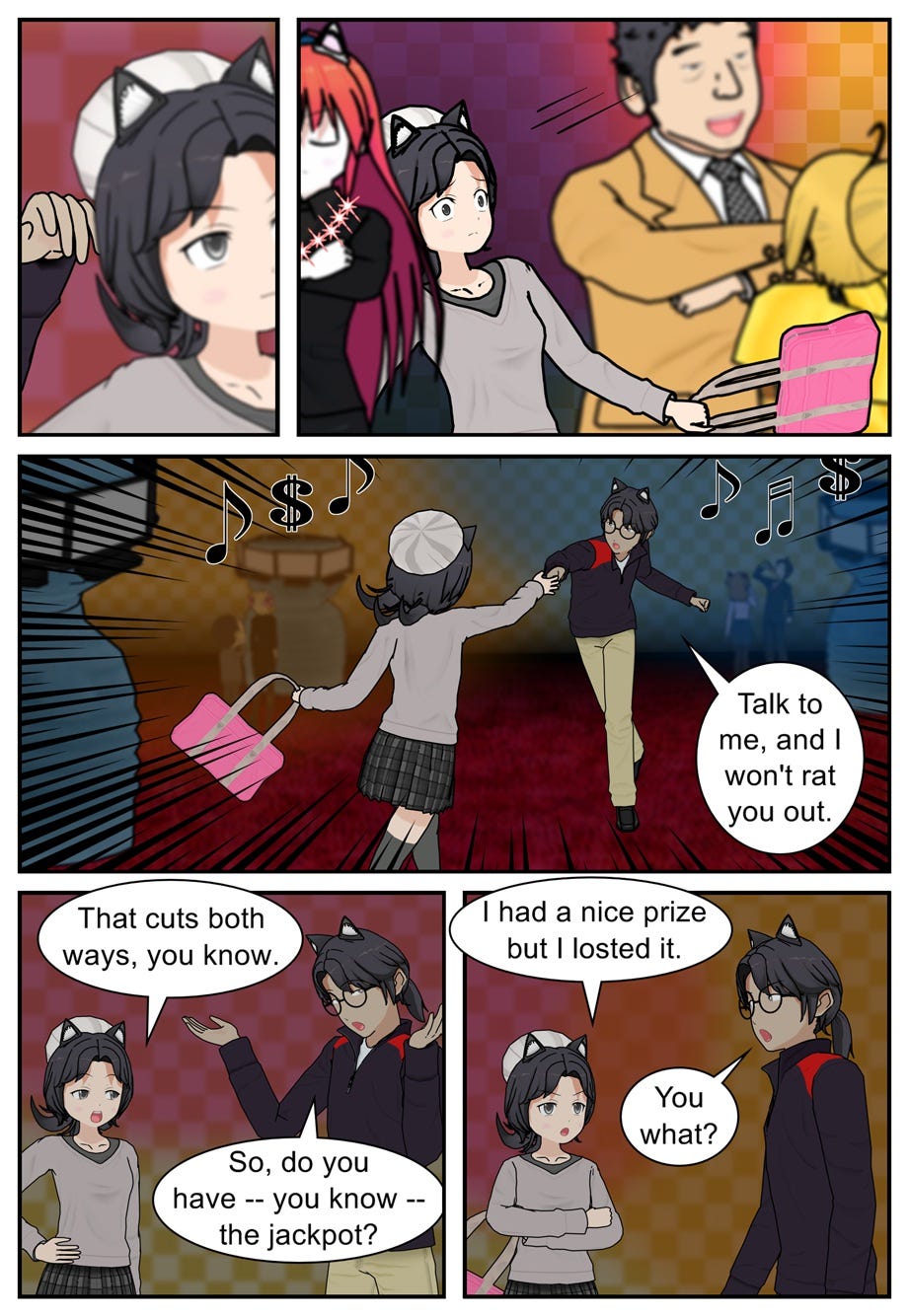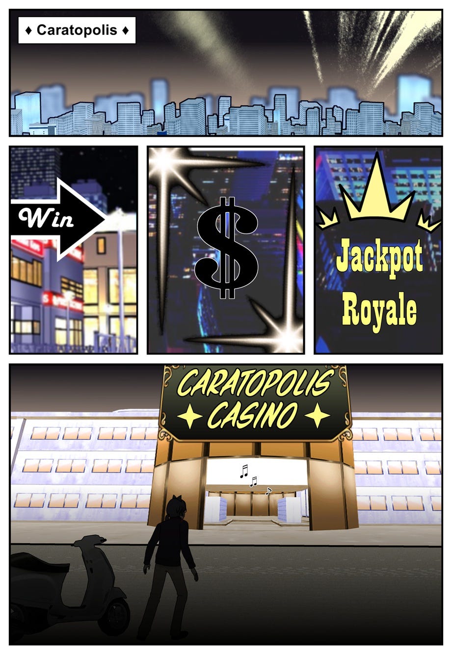 After reading Beezle Forentula’s correspondence, then recognizing Rae Misere in a poster for Caratopolis Casino, Ruff Shuffle heads over to resume his original investigation…