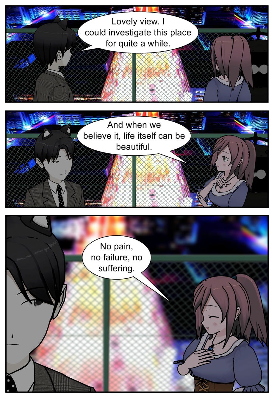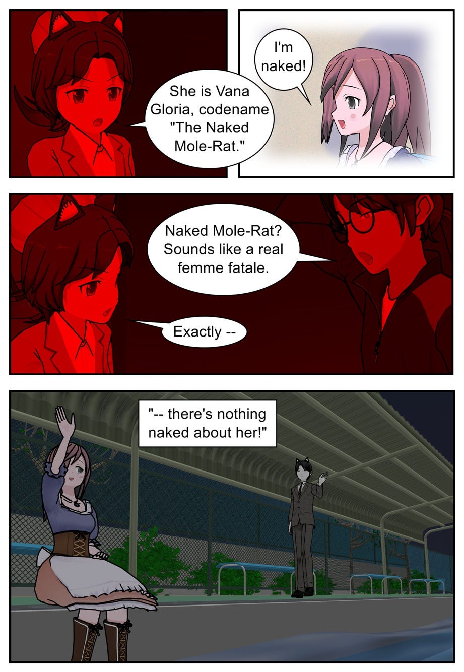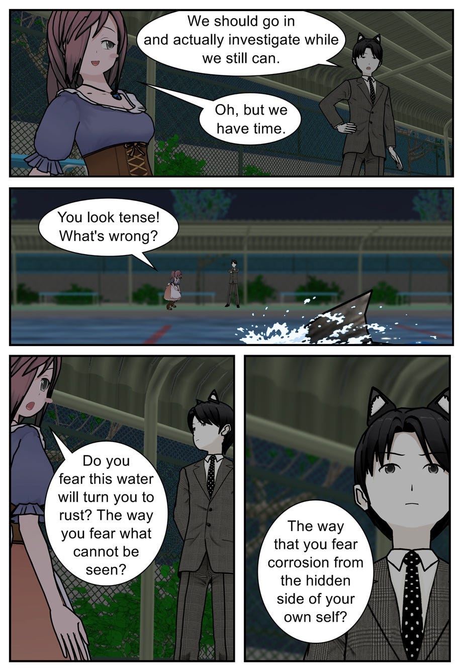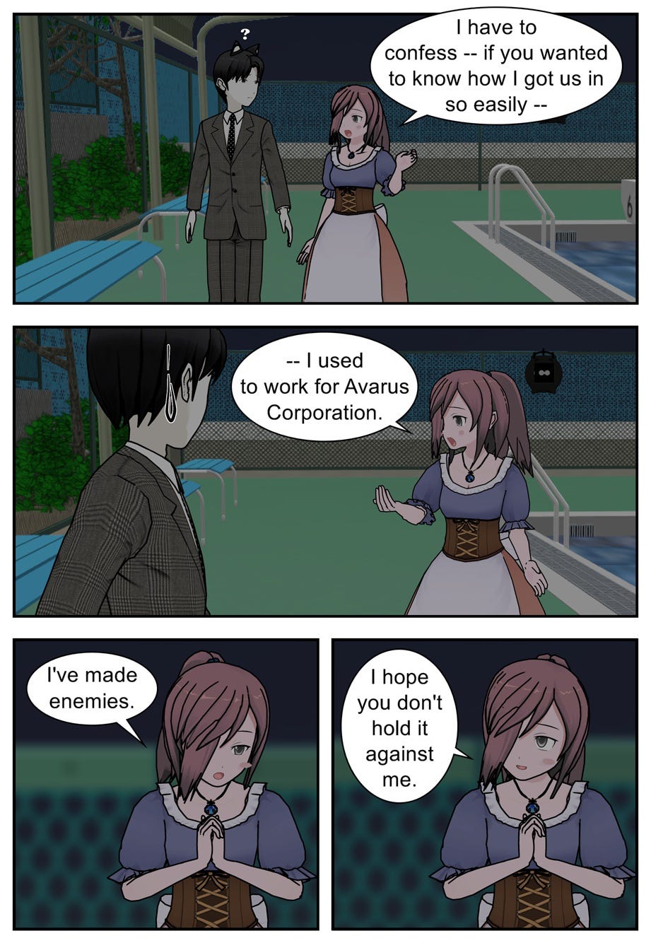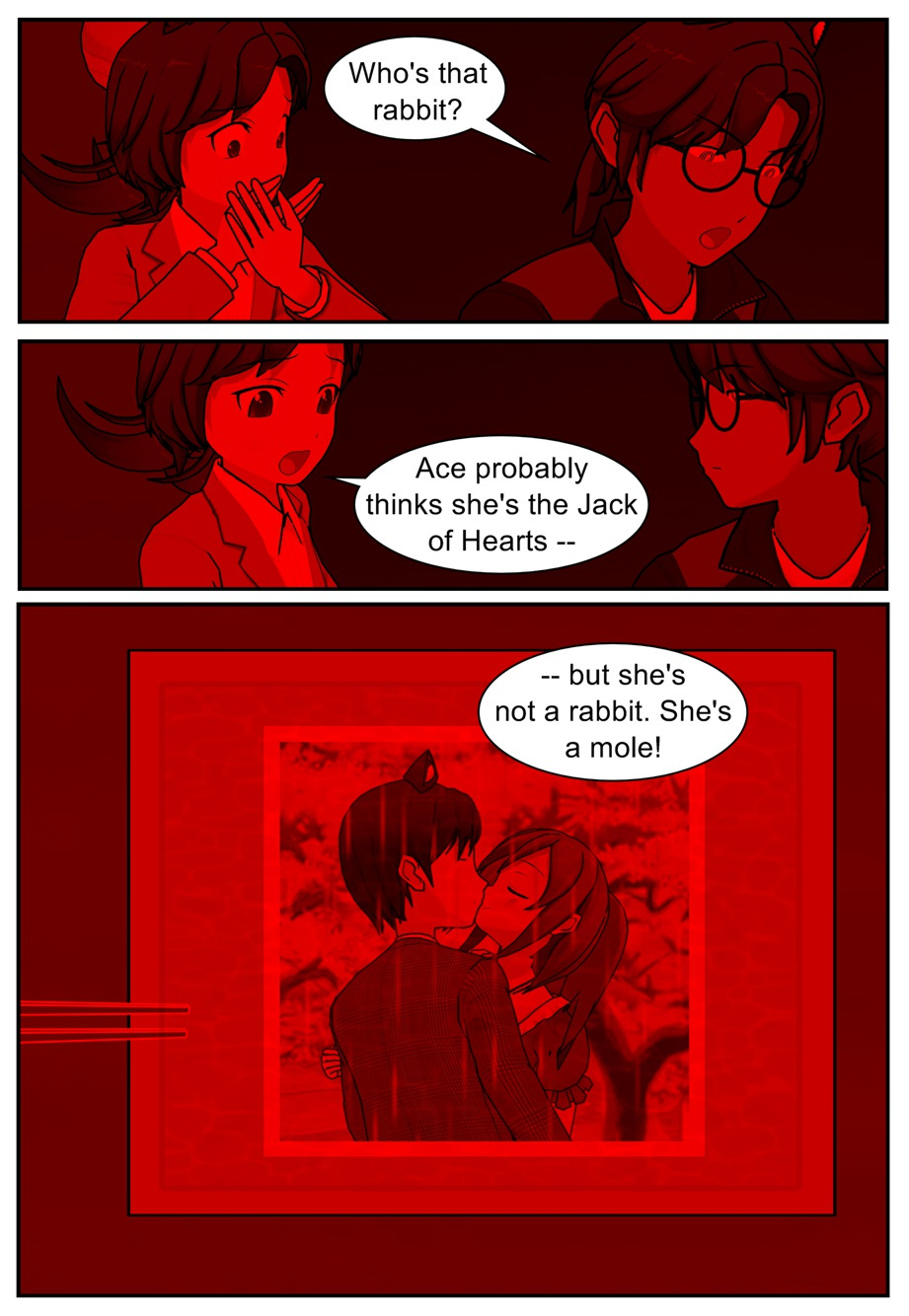 The story so far: Rival spies Ruff and Rae find themselves in a darkroom together, trying to parse out a photo of Ace and his ethereal female friend. Meanwhile, Ace himself wants to look into Avarus Mammony, whose henchmen have kidnapped Mouse the Joker. Vana, who had helped Ace to escape Cora Zone earlier that evening, tries to persuade Ace to leave his employer — the Excalibur Intelligence Agency — and join the legendary hero C.A.R.D.S. with her instead. Although part of him is drawn to Vana’s idealism, Ace resolves to return to reality, redeem himself to the EIA, and turn in Vana as the agency’s number one target — the Jack of Hearts…